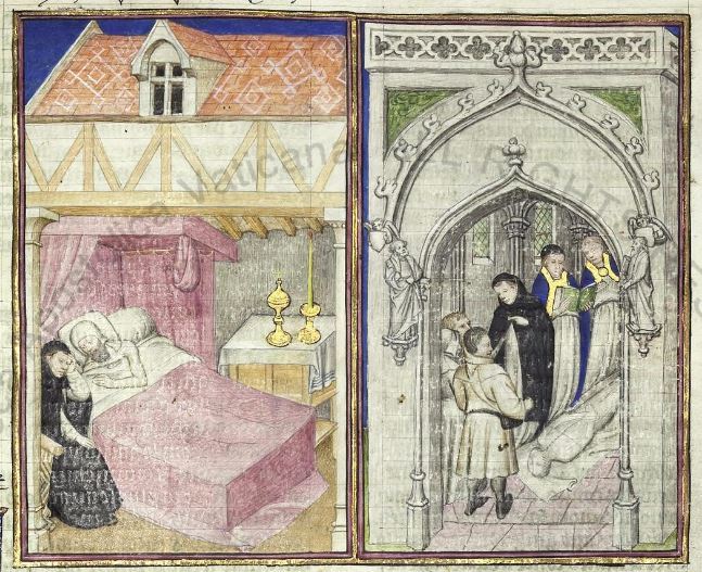 Maestro della Cité des Dames (1414-1419), La confessione di Ser Ciappelletto morente; funerale di Ser Ciappelletto