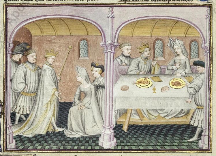 Maestro della Cité des Dames (1414-1419), La marchesa del Monferrato riceve Filippo il Bornio; i nobili siedono a banchetto