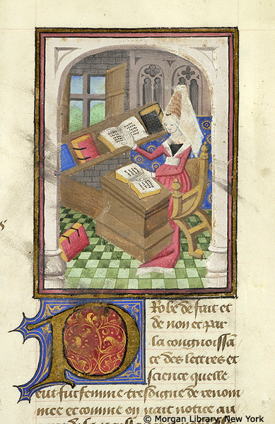 New York, Pierpont Morgan Library, M 381, f. 60r. Proba, seduta nel suo studio, sfoglia alcuni libri.