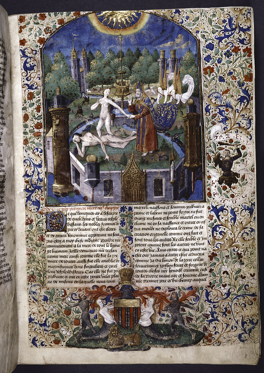 New York, Public Library, Spencer 33, f. 3r. Nel giardino dell'Eden Dio crea Eva dalla costola di Adamo dormiente.