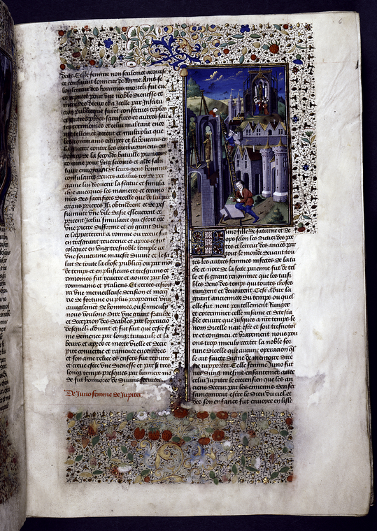 New York, Public Library, Spencer 33, f. 6r. I fedeli erigono un tempio per Giunone; all'interno dell'edificio un gruppo di devoti rendono omaggio alla statua aurea della dea.