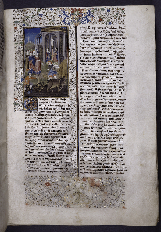 New York, Public Library, Spencer 33, f. 7r. La dea Cerere, accompagnata da tre donne, insegna ai contadini ad arare, mietere e seminare; all'interno del tempio un gruppo di fedeli…