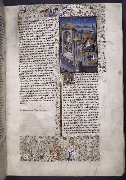 New York, Public Library, Spencer 33, f. 5v. Opi, innalzata su un piedistallo all'interno di un tempio, riceve gli omaggi di un gruppo di devoti.
