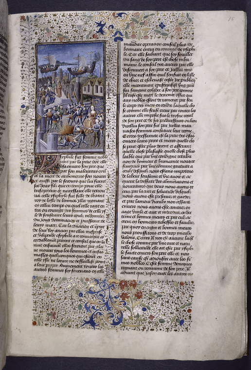 New York, Public Library, Spencer 33, f. 15r. Isifile siede sul trono in una piazza dinanzi alla pira funebre del marito, mentre le donne di Lemno massacrano gli uomini dell'isola;…