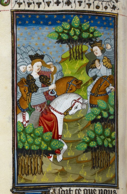 Londra, British Library, Royal 16 G V, f. 86v. Beronice sul carro da guerra mette in fuga degli uomini armati.