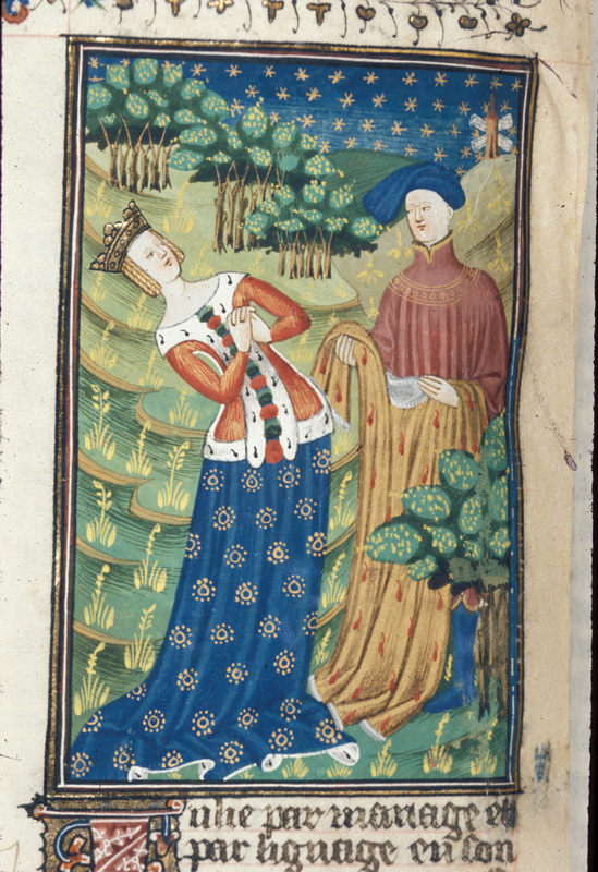 Londra, British Library, Royal 16 G V, f. 93r. Sempronia viene corteggiata da un uomo; accanto ai due si trovano un altro personaggio maschile e un tavolo su cui sono poggiati degl…