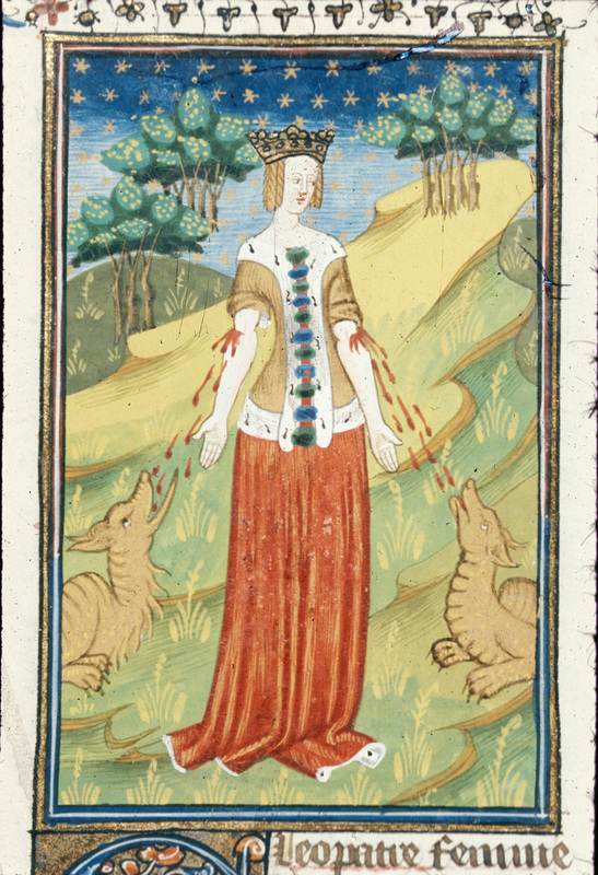 Londra, British Library, Royal 16 G V, f. 101r. Cleopatra si suicida facendosi mordere da due aspidi (rappresentati come due draghi).