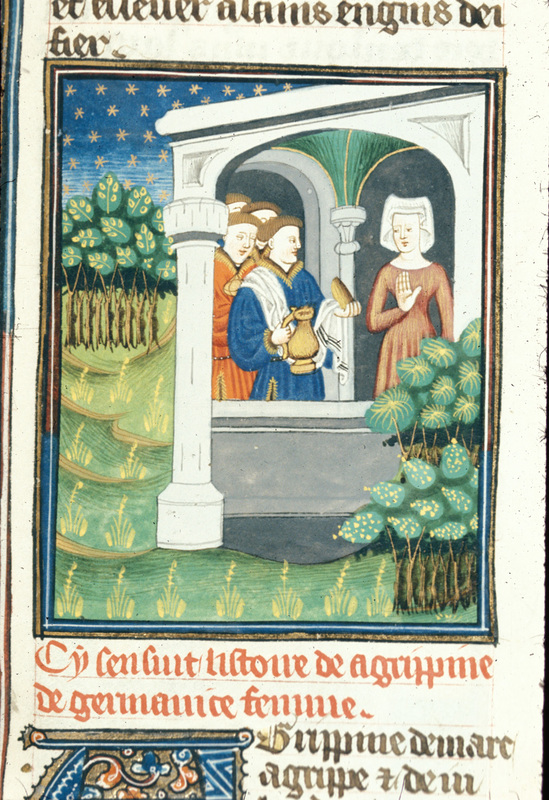 Londra, British Library, Royal 16 G V, f. 105r. Agrippina rifiuta l'acqua e il cibo offertogli da un servitore.
