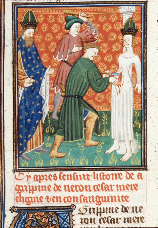 Londra, British Library, Royal 16 G V, f. 107r. Agrippina minore, legata ad una colonna, viene pugnalata a morte dai due sicari inviati dal figlio Nerone, il quale assiste alla sce…