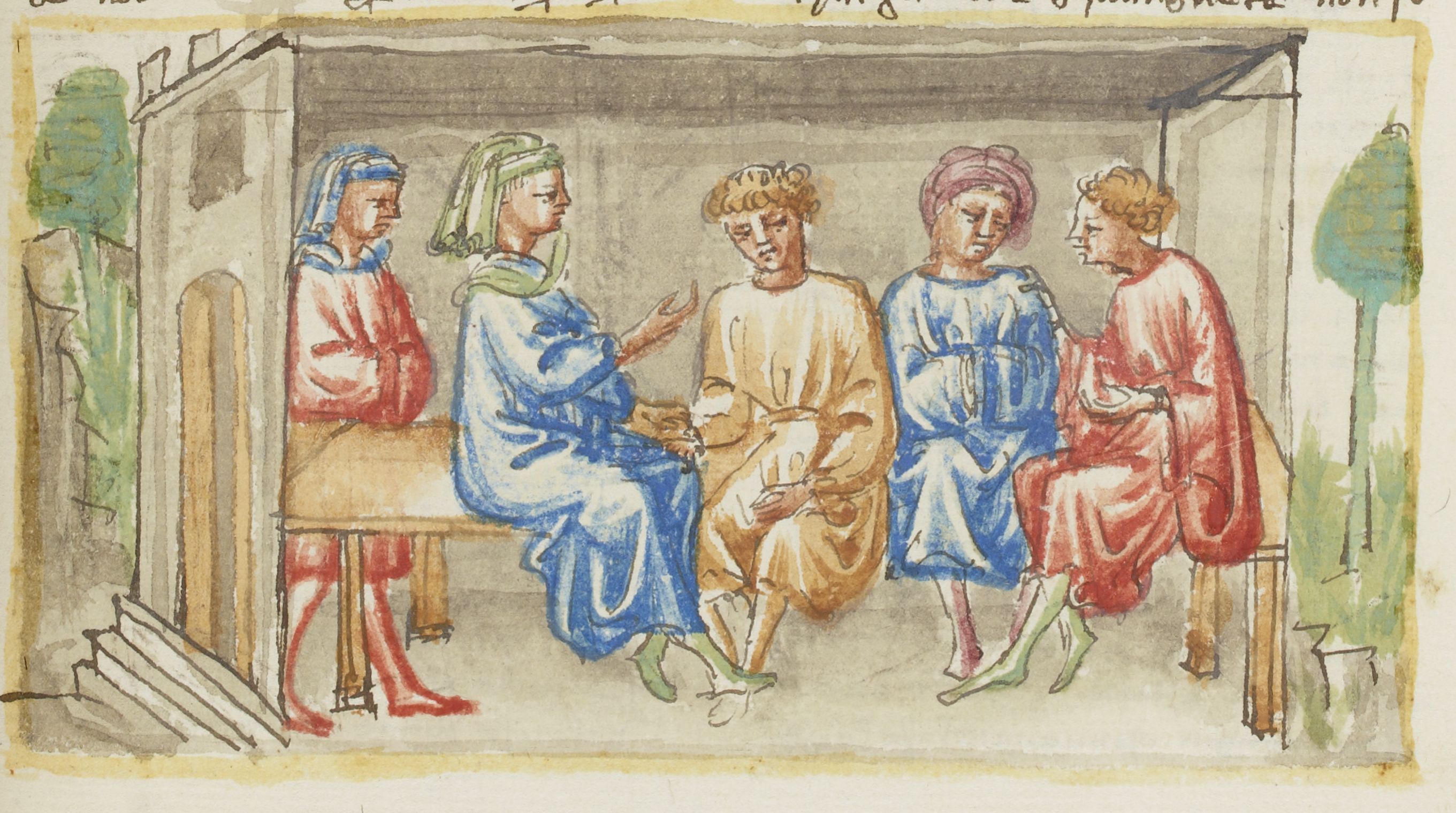 Parigi, Bibliothèque Nationale de France, It. 63, f. 201r. Il copista del manoscritto, datato 10 ottobre 1427, è Ludovico di Salvestro Ceffini. Michele Scalza discute con i suoi amici su quale sia la stirpe più antica.