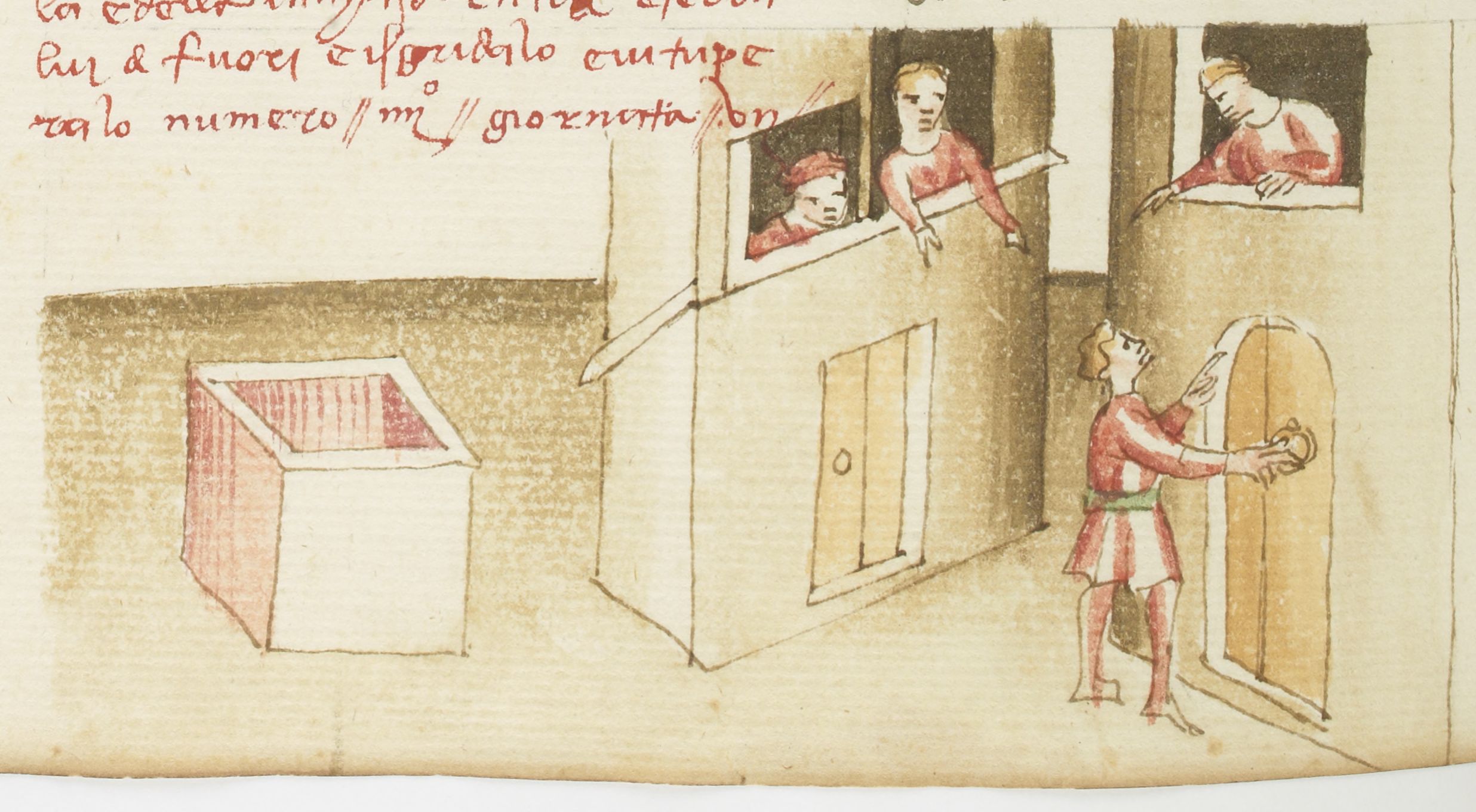 Parigi, Bibliothèque Nationale de France, It. 63, f. 215v. Il copista del manoscritto, datato 10 ottobre 1427, è Ludovico di Salvestro Ceffini. Tofano, rimasto chiuso fuori casa, discute con la moglie Ghita alla finestra.