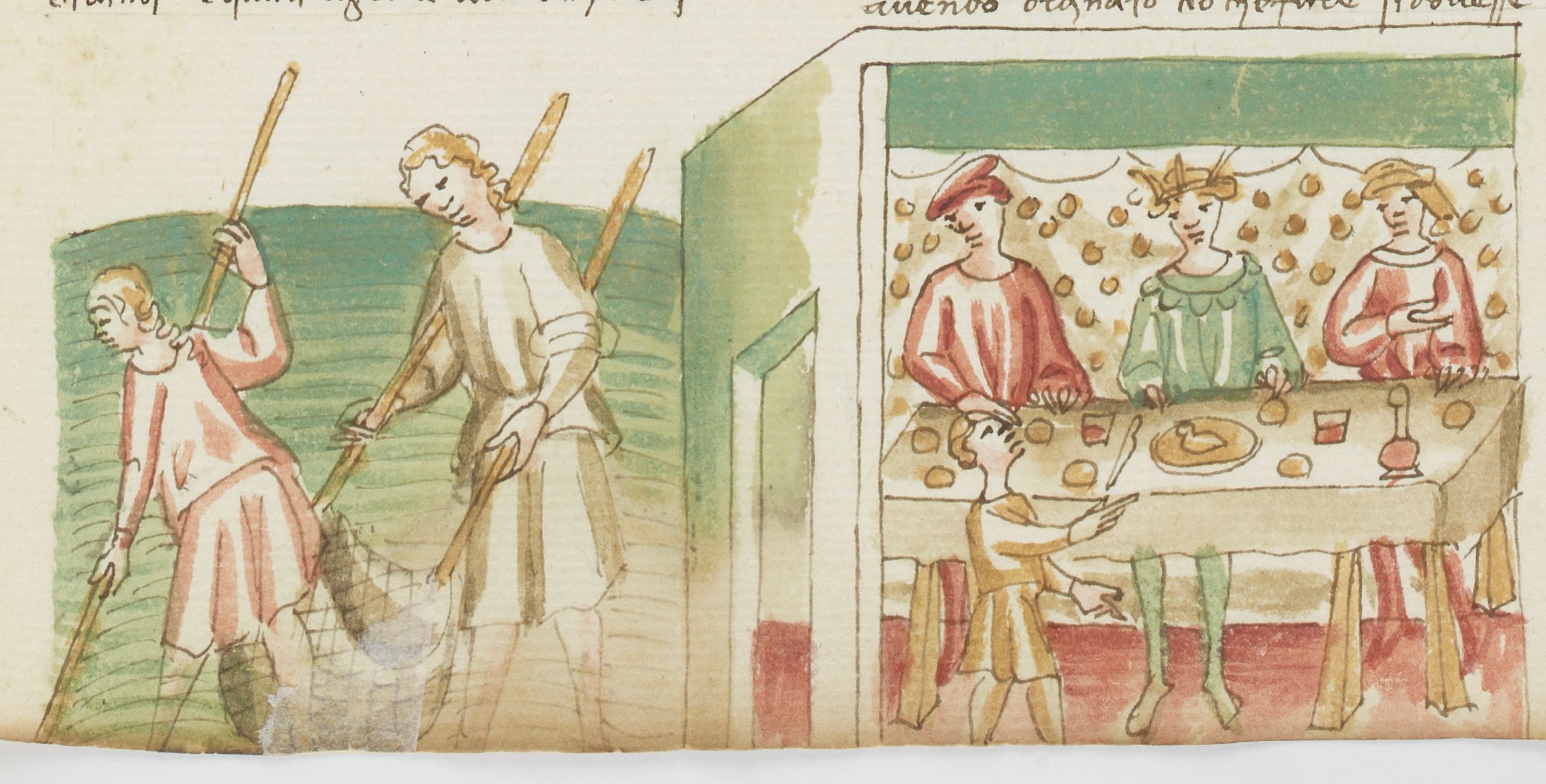 Parigi, Bibliothèque Nationale de France, It. 63, f. 284r. Il copista del manoscritto, datato 10 ottobre 1427, è Ludovico di Salvestro Ceffini. Re Carlo I, ospite alla tavola di Neri degli Uberti, osserva le figlie del cavaliere uscire per andare a pesca.
