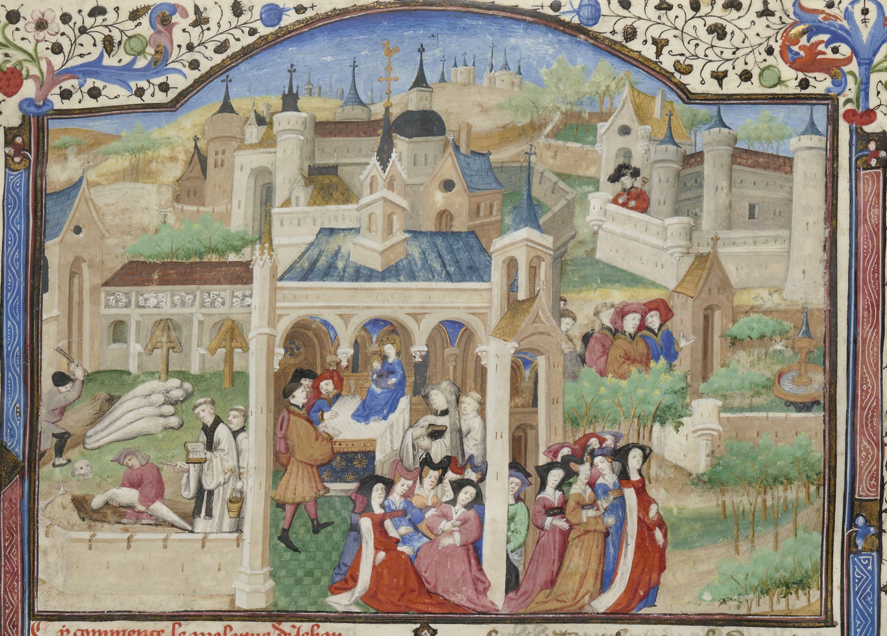 Parigi, Bibliothèque Nationale de France, Fr. 239, f. 1r. In un cimitero fiorentino vengono seppellite le vittime della peste; la compagnia di sette fanciulle e tre giovani si riunisce nella chiesa di Santa Maria Novella; i dieci novellatori si mettono in viaggio verso la villa di Fiesole.
