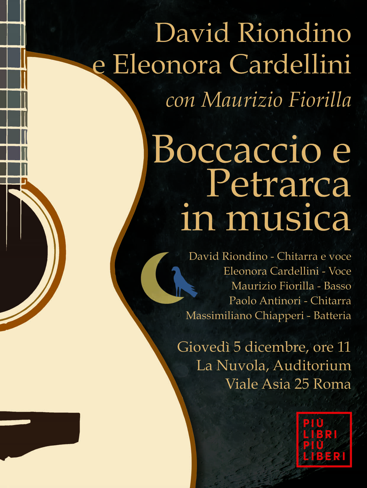 David Riondino (cantautore, musicista, regista, scrittore) e Eleonora Cardellini (cantautrice), insieme a Maurizio Fiorilla (filologo e musicista), presentano le canzoni tratte dai loro album musicali dedicati al Decameron di Giovanni Boccaccio (D. Riondino, Bocca baciata non perde ventura anzi rinnova come fa la luna, Prefazione di M. Fiorilla, Materiali sonori, 2014) e al Canzoniere di Francesco Petrarca (E. Cardellini, Qui regna amore. Dal Canzoniere di Petrarca a ‘Let it be’, Prefazione di G. Zaccaria, Saggi introduttivi di M. Fiorilla e D. Pisano, Con tre studi su Petrarca e la musica di L. Zuliani, G. Perucchi e F. Mehltretter, Roma-Padova, Antenore, 2024).