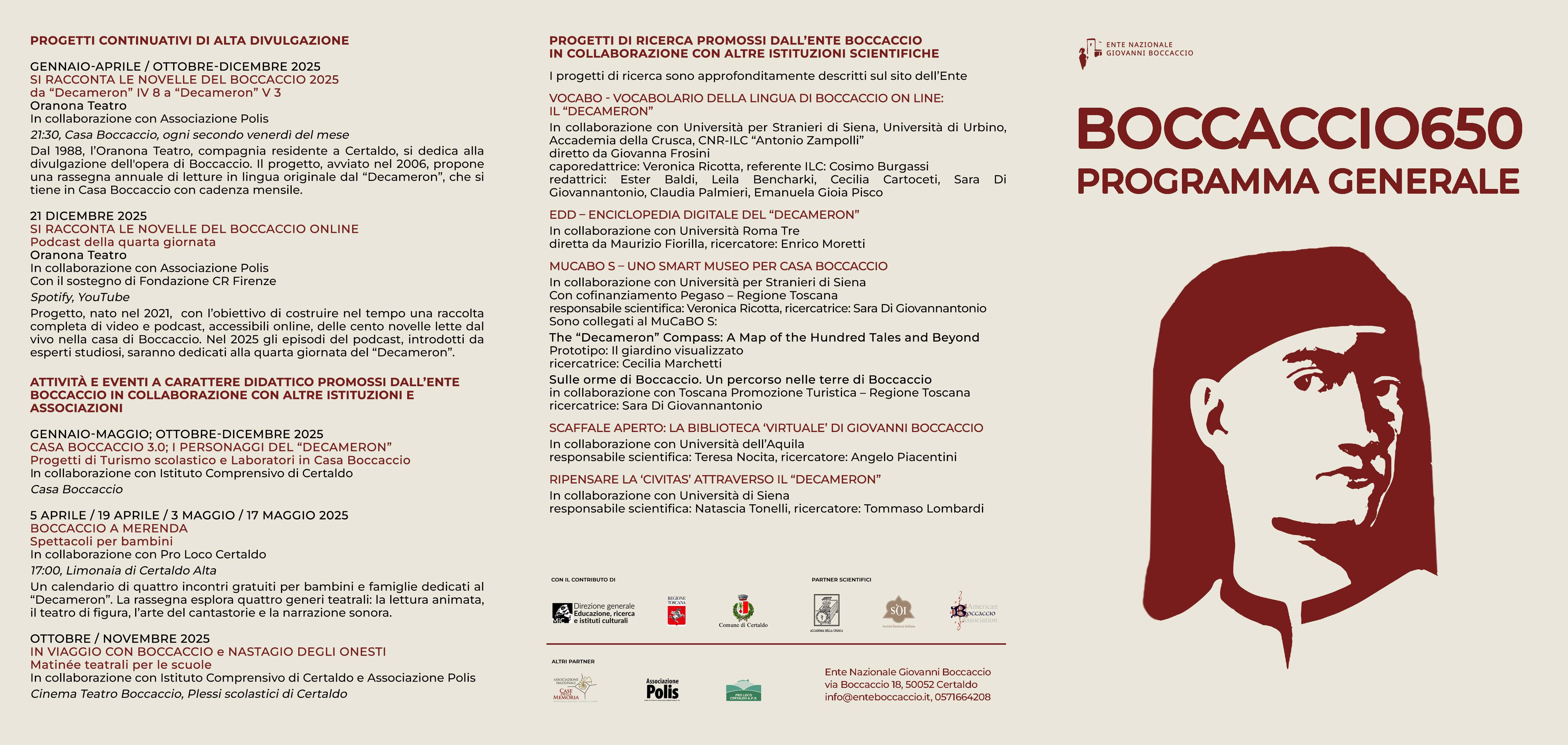 Il programma ideato per le celebrazioni "Boccaccio650" è un vero e proprio progetto scientifico e culturale, sulla cui base si proiettano gli impegni del futuro e sul quale l’Ente Boccaccio lavora da due anni insieme ai professori, gli studiosi e i funzionari dei Consigli direttivo e scientifico. Un programma che evidenzia la vasta rete di collaborazioni che lo animano e lo sostengono con Università di tutta la Toscana, di tutta Italia, della Francia e degli Stati Uniti, con istituzioni scientifiche di alto prestigio e di illustre tradizione, quali l’Accademia della Crusca, la Società Dantesca Italiana, il CNR di Pisa, la Biblioteca Nazionale Centrale di Firenze, l’istituzione consorella American Boccaccio Association e realizzato col contributo della Direzione generale Educazione, ricerca e istituti culturali del Ministero italiano della Cultura, della Regione Toscana, del Comune di Certaldo.