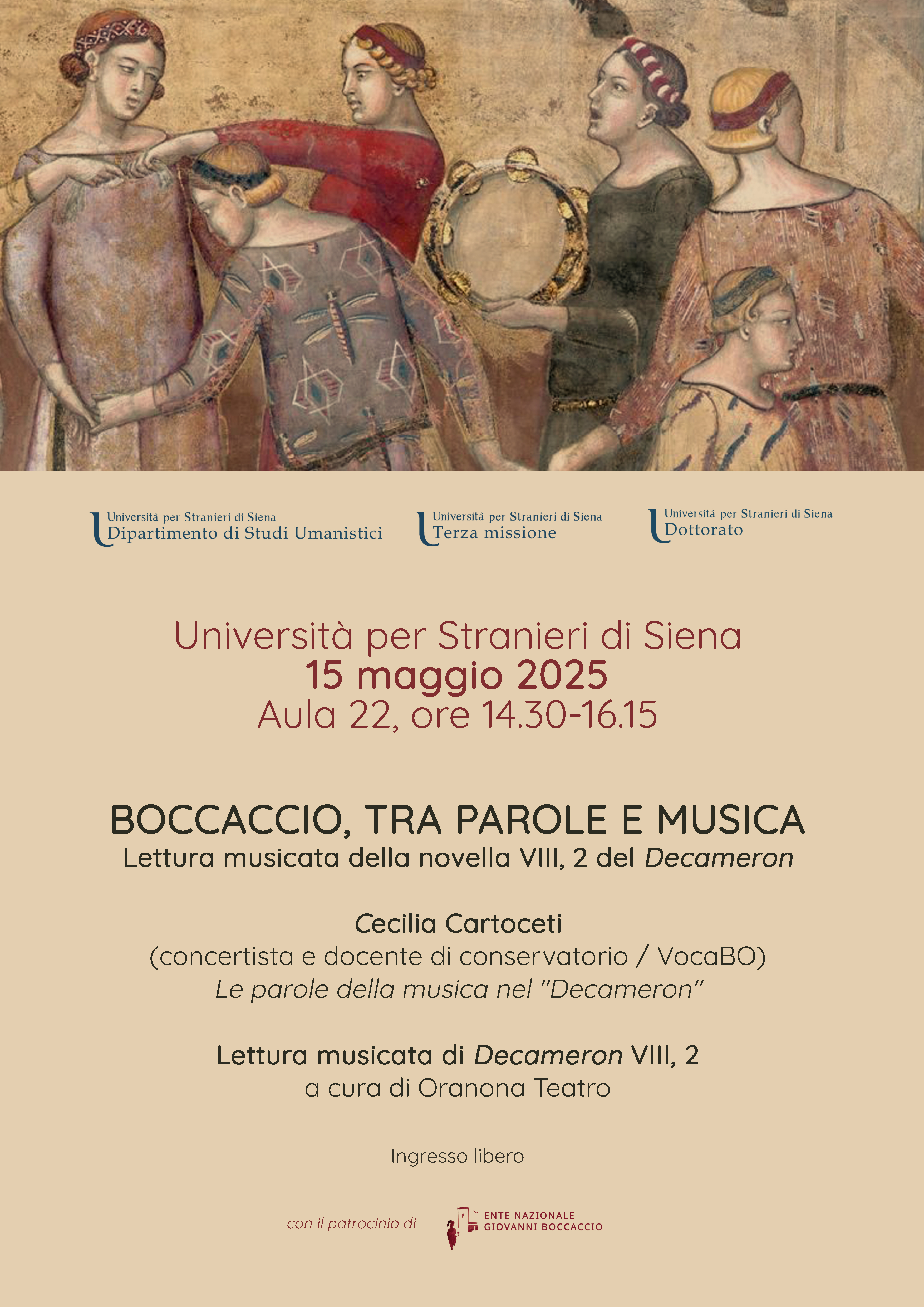 L’iniziativa di Terza Missione del Dipartimento di Studi Umanistici propone la presentazione dei temi e della novella VIII, 2 del Decameron, a cura di Cecilia Cartoceti, concertista e docente di conservatorio, e Veronica Ricotta.