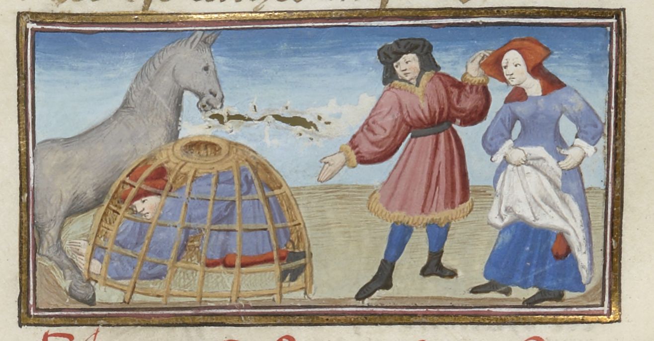 Parigi, Bibliothèque Nationale de France, Fr. 239, f. 165r. Pietro di Vinciolo scopre l'amante della moglie nascosto sotto la stia del pollame, poiché l'asino pesta le dita dell'uomo.