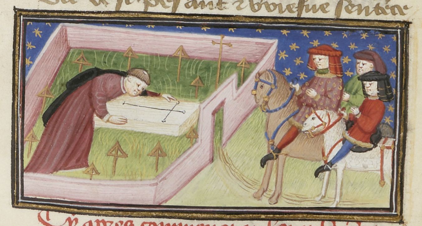 Parigi, Bibliothèque Nationale de France, Fr. 239, f. 178r. Betto Brunelleschi e la sua brigata giungono a cavallo al cimitero dove Guido Cavalcanti si trova presso una lapide.