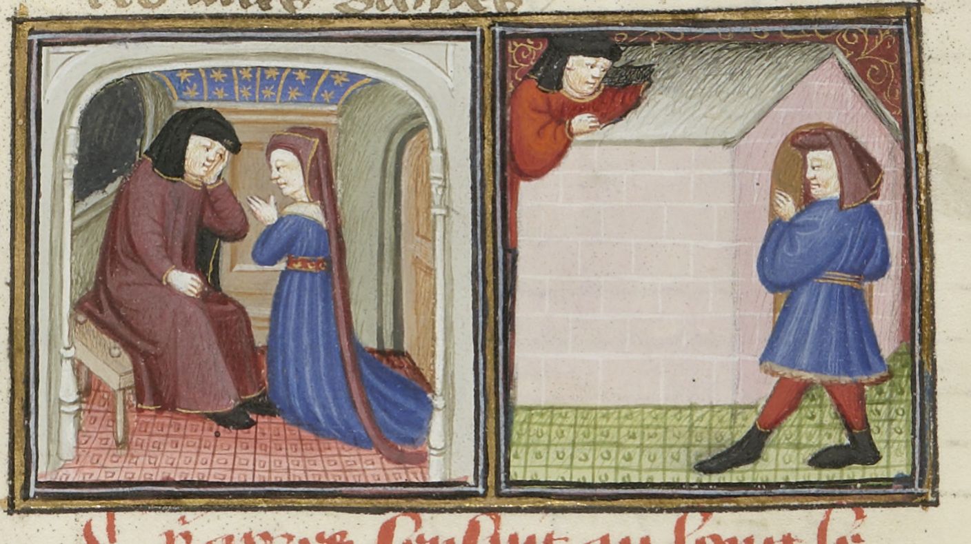 Parigi, Bibliothèque Nationale de France, Fr. 239, f. 193v. Arimino, travestito da prete, ascolta la confessione della moglie; durante la notte l'uomo monta la guardia davanti alla porta, mentre l'amante entra nella casa dal tetto.