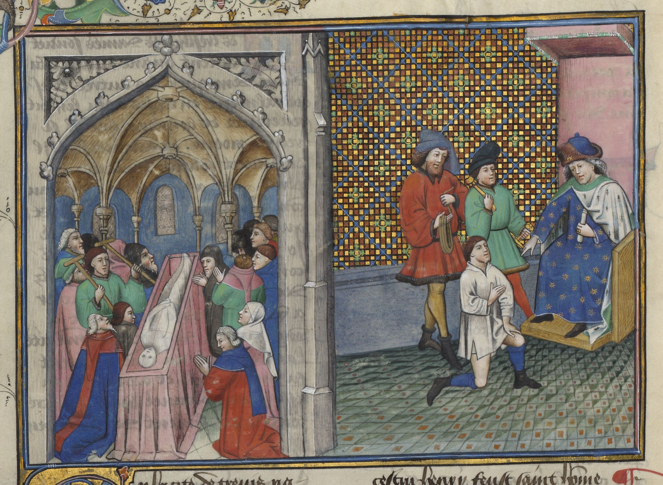 Maestro di Guillebert de Mets (1430-1450), Gli storpi e gli afflitti si recano presso la salma di Sant'Arrigo; Martellino compare in tribunale