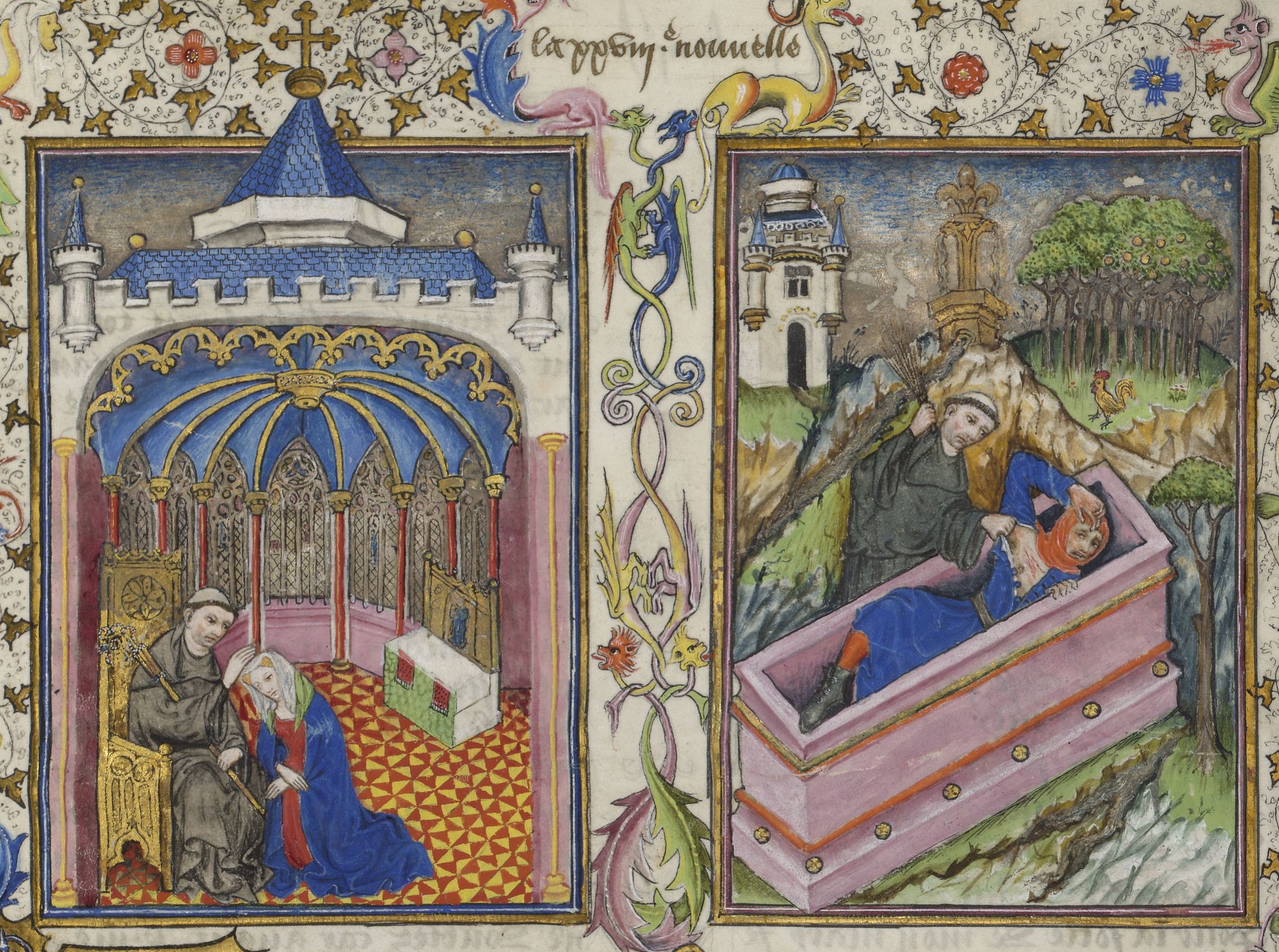 Maestro di Guillebert de Mets (1430-1450), La moglie di Ferondo si confessa con l'abate; l'abate punisce Ferondo