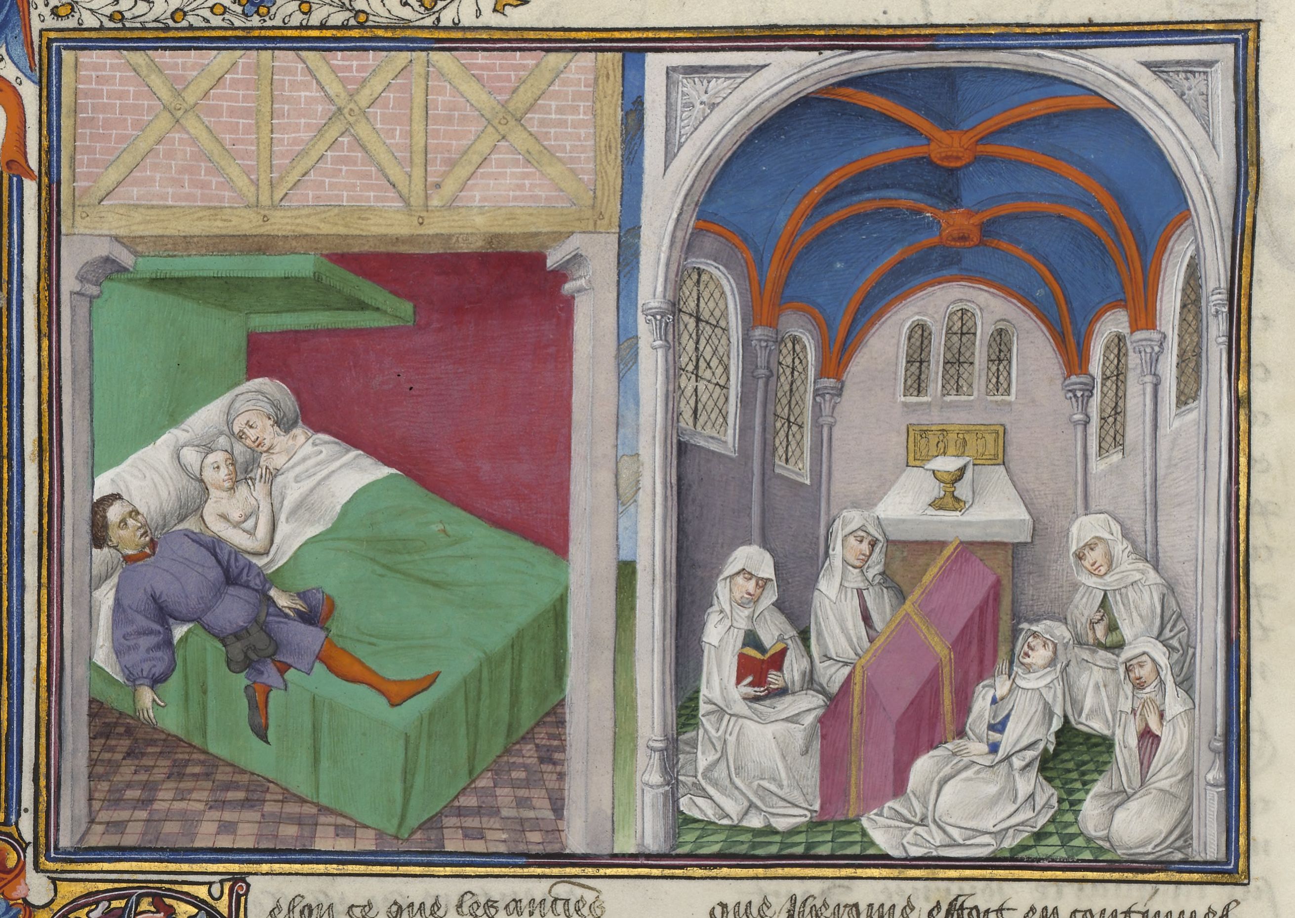Maestro di Jean Mansel (1430-1450), Girolamo muore sul letto di Salvestra; Salvestra muore dinanzi alla bara di Girolamo