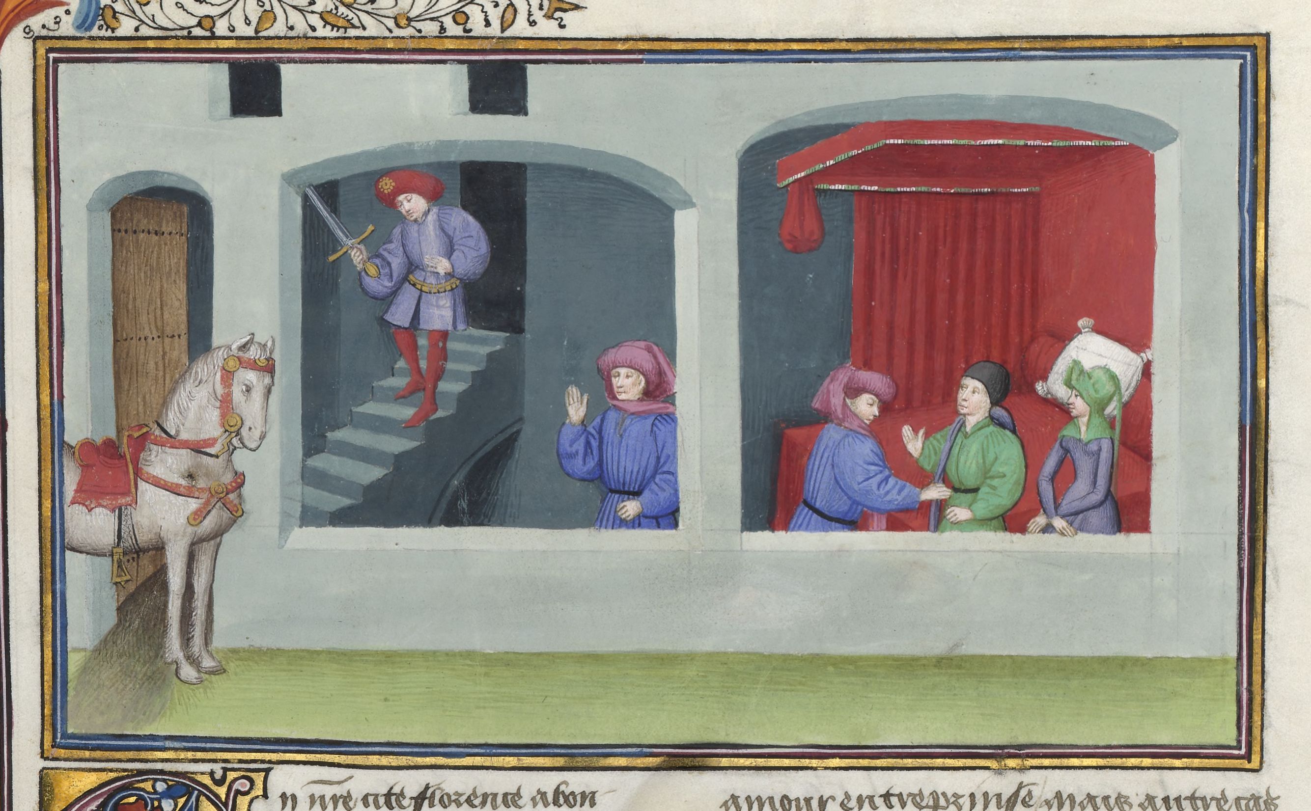Parigi, Bibliothèque de l'Arsenal, 5070, f. 258v. Il copista del manoscritto è Guillebert de Mets. Il cavaliere Lambertuccio scappa dalla camera di Isabella con la spada sguainata, spaventando il marito; l'uomo, recatosi in camera della moglie, vi trova il suo amante Lionetto.