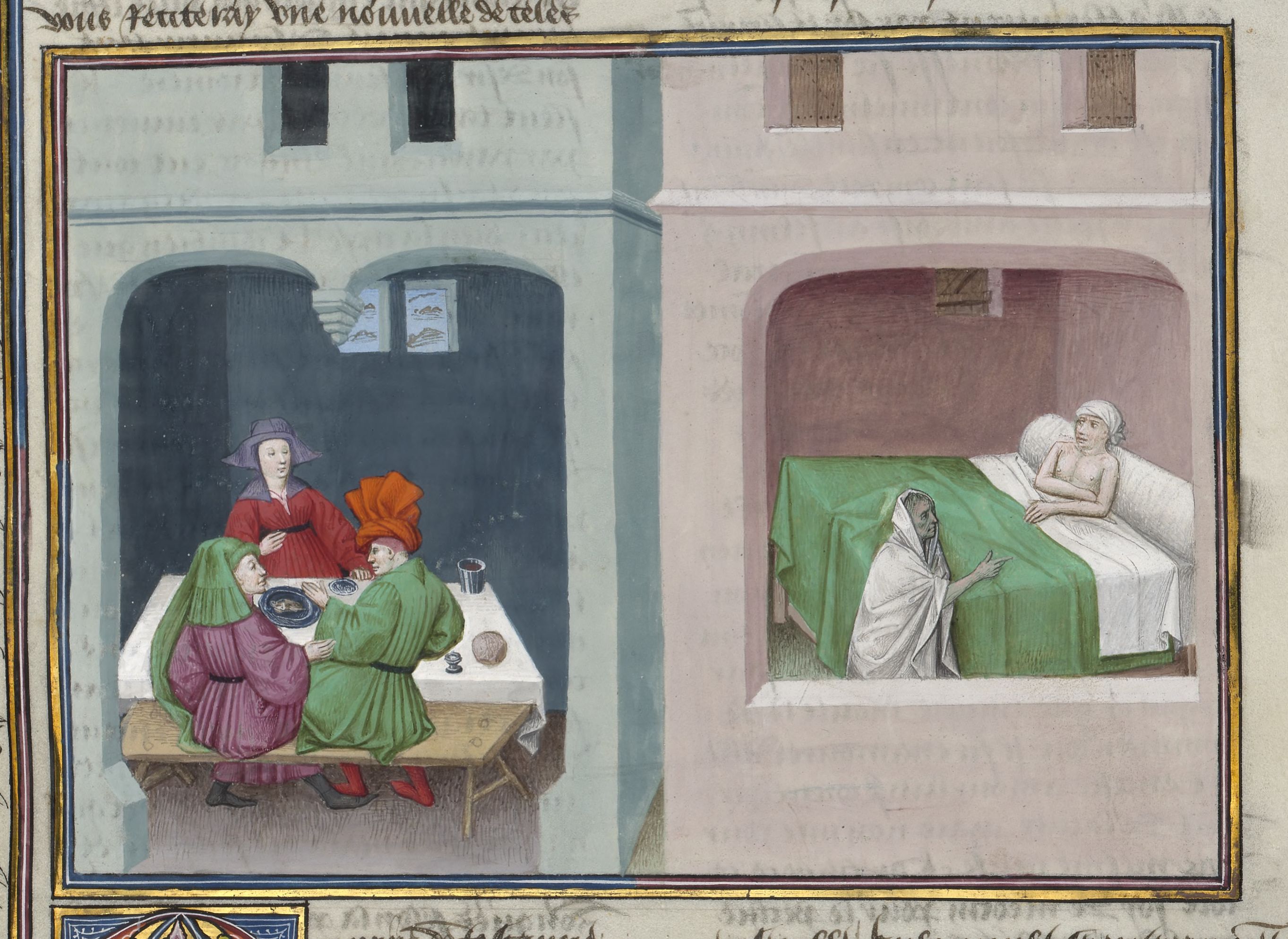 Parigi, Bibliothèque de l'Arsenal, 5070, f. 273r. Il copista del manoscritto è Guillebert de Mets. I due amici Tingoccio e Meuccio siedono a tavola con monna Mita; dopo esser morto, Tingoccio appare a Meuccio nella sua stanza.