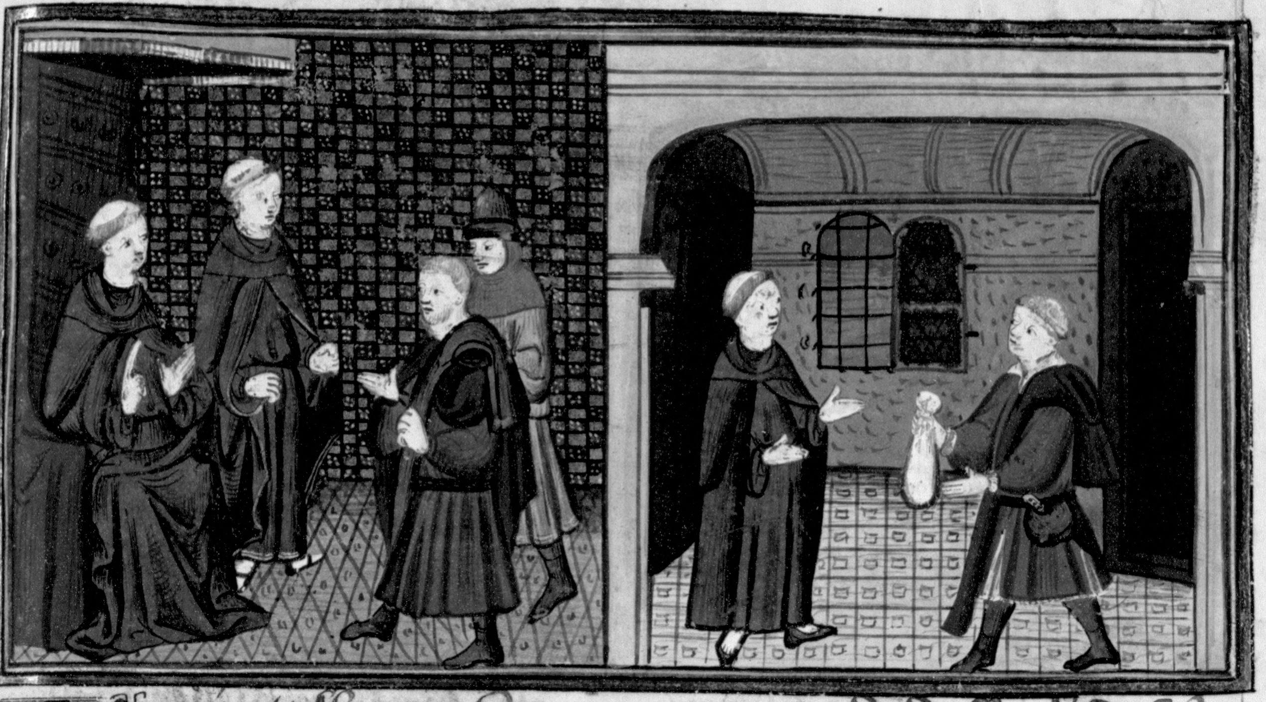 Parigi, Bibliothèque Nationale de France, Fr. 12421, f. 31r. Un uomo viene interrogato da un frate inquisitore; l'inquisitore riceve di nascosto del denaro.