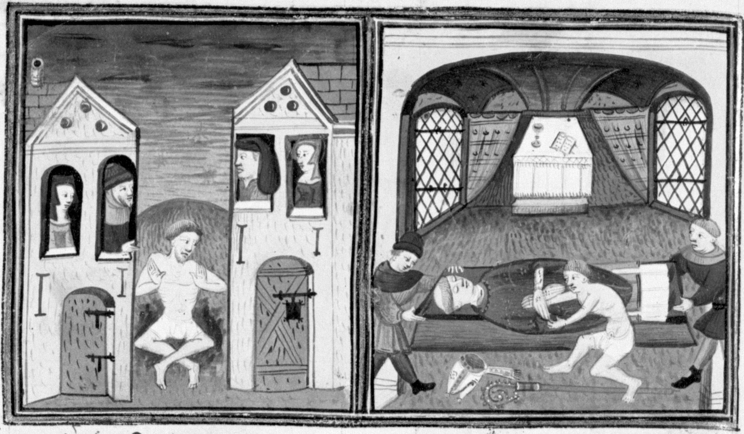 Parigi, Bibliothèque Nationale de France, Fr. 12421, f. 61v. Andreuccio da Perugia cade nudo nelle latrine, osservato da quattro personaggi affacciati alle finestre; Andreuccio aiuta due ladri a depredare la tomba del vescovo.