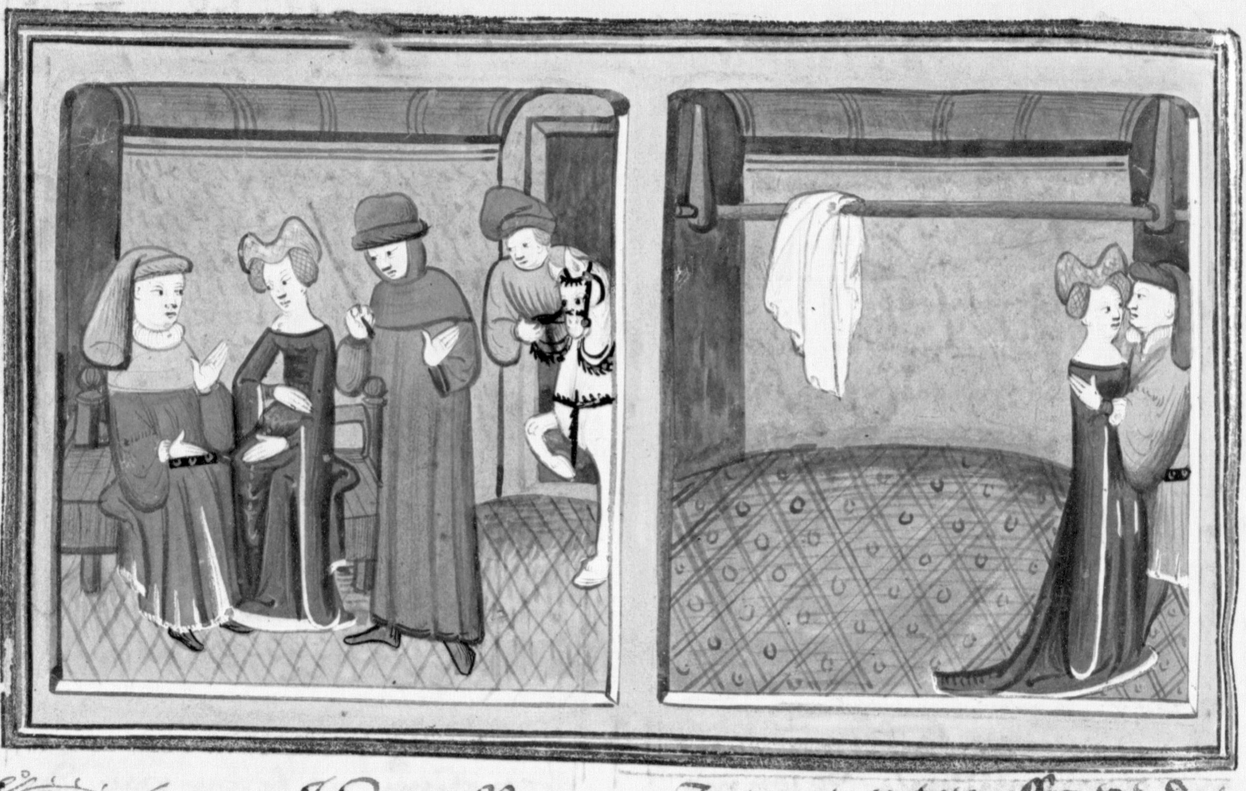 Parigi, Bibliothèque Nationale de France, Fr. 12421, f. 129v. Francesco Vergellesi concede a Zima di parlare con sua moglie ottenendone in cambio un cavallo; la moglie di Francesco, avendo steso due asciugamani come segnale convenuto, incontra Zima e si scambia con lui un bacio.