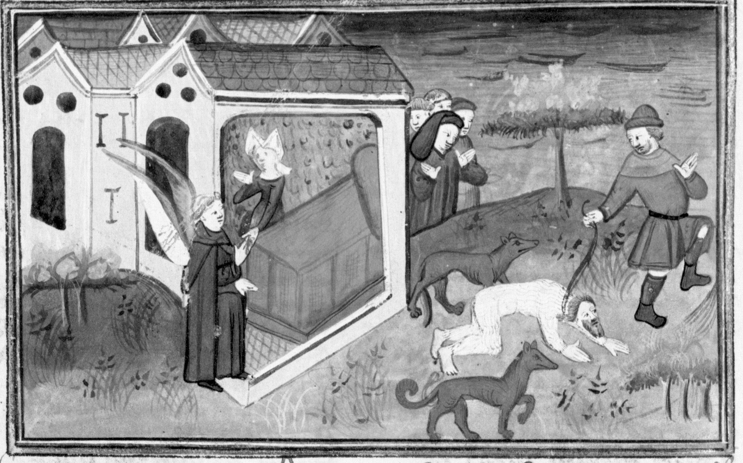 Parigi, Bibliothèque Nationale de France, Fr. 12421, f. 174v. rate Alberto, travestito da angelo Gabriele, visita madonna Lisetta; Alberto, vestito da uomo selvatico, viene trascinato per strada con dei cani e vituperato dalla folla.