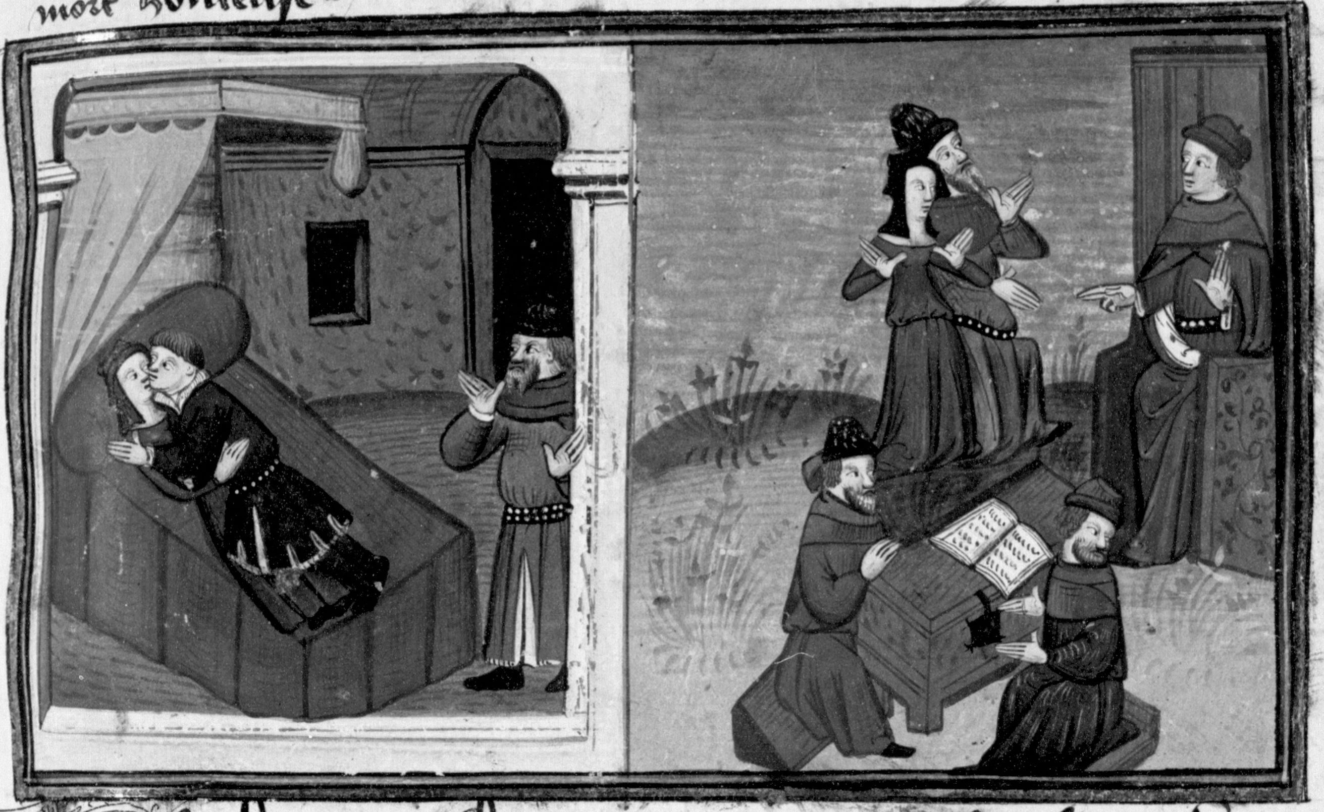 Parigi, Bibliothèque Nationale de France, Fr. 12421, f. 268r. Filippa viene scoperta dal marito durante l'adulterio; la donna si difende dinanzi al giudice e fa cambiare lo statuto della città di Prato.