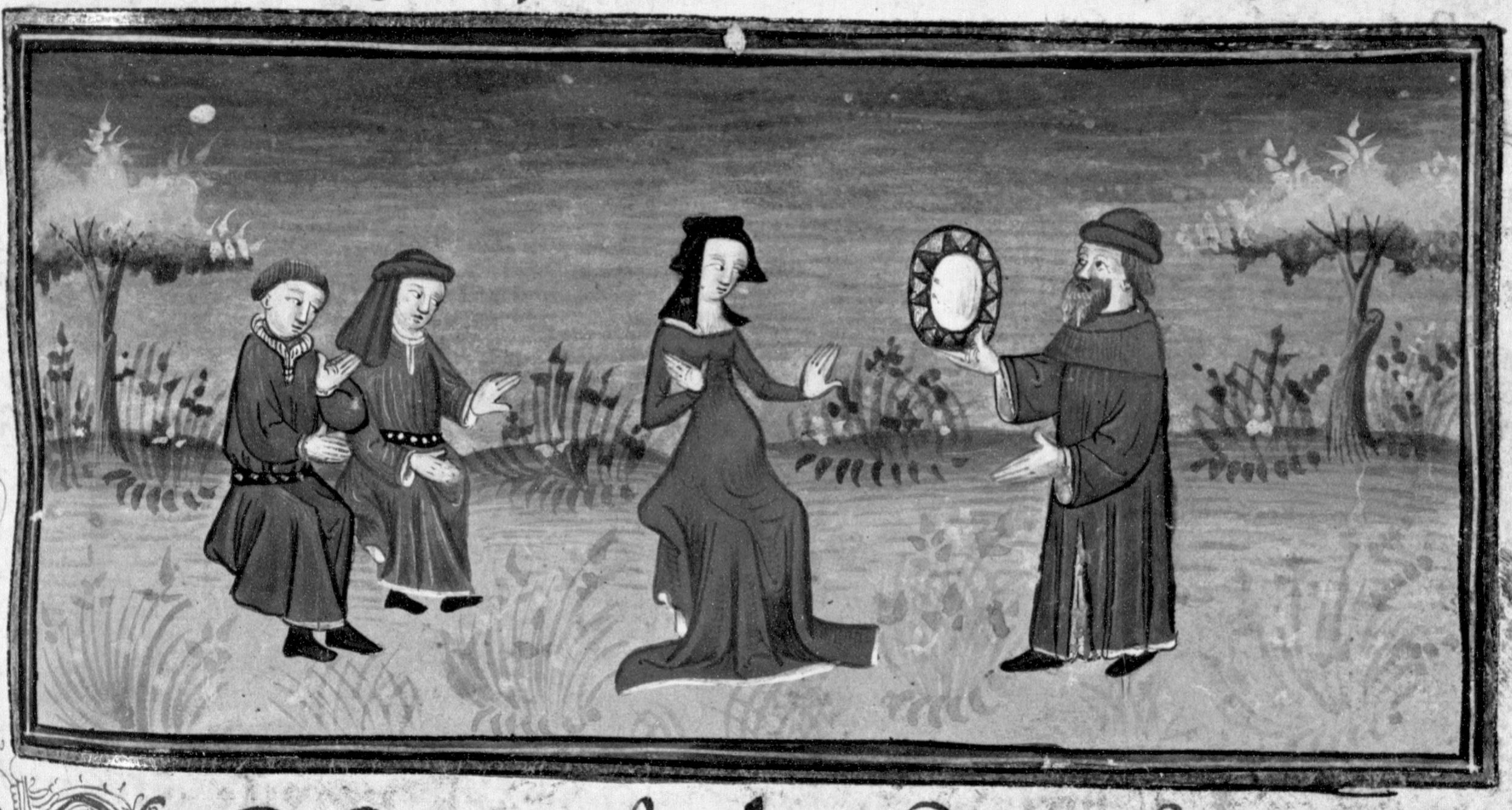 Parigi, Bibliothèque Nationale de France, Fr. 12421, f. 270r. Cesca disdegna altezzosamente le attenzioni di due uomini, mentre lo zio Fresco da Celatico le porge uno specchio consigliandole di non specchiarsi mai più.