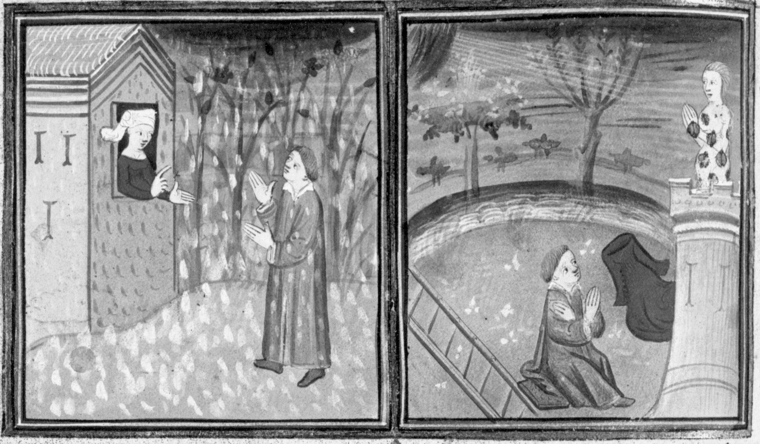 Parigi, Bibliothèque Nationale de France, Fr. 12421, f. 340v. In una notte d'inverno la vedova Elena chiude Rinieri fuori casa; per vendetta Rinieri lascia la donna nuda in cima ad una torre, esposta al sole ed agli insetti.