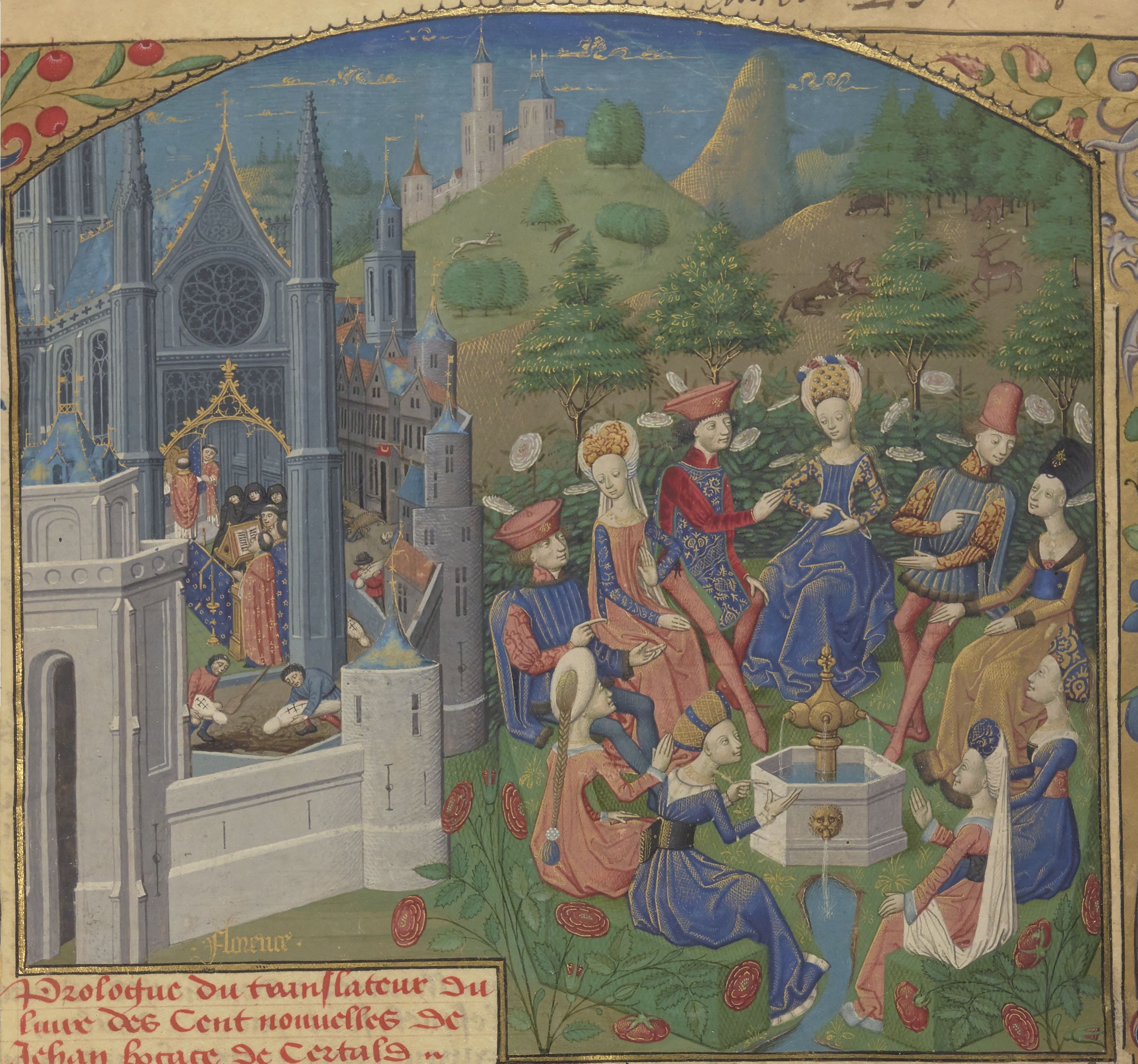 Parigi, Bibliothèque Nationale de France, Fr. 129, f. 1r. A Firenze infuria la peste, i cadaveri vengono raccolti dalle strade e seppelliti mentre in chiesa viene celebrata una messa; intanto la compagnia dei dieci novellatori siede nel giardino fiesolano intorno alla fontana.