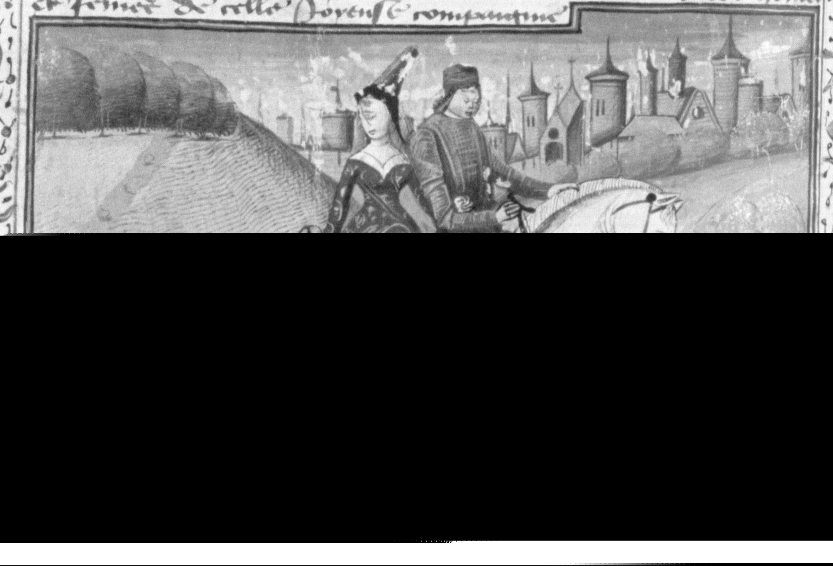 Parigi, Bibliothèque Nationale de France, Fr. 240, f. 172v. Madonna Oretta accetta di cavalcare insieme al proprio accompagnatore.