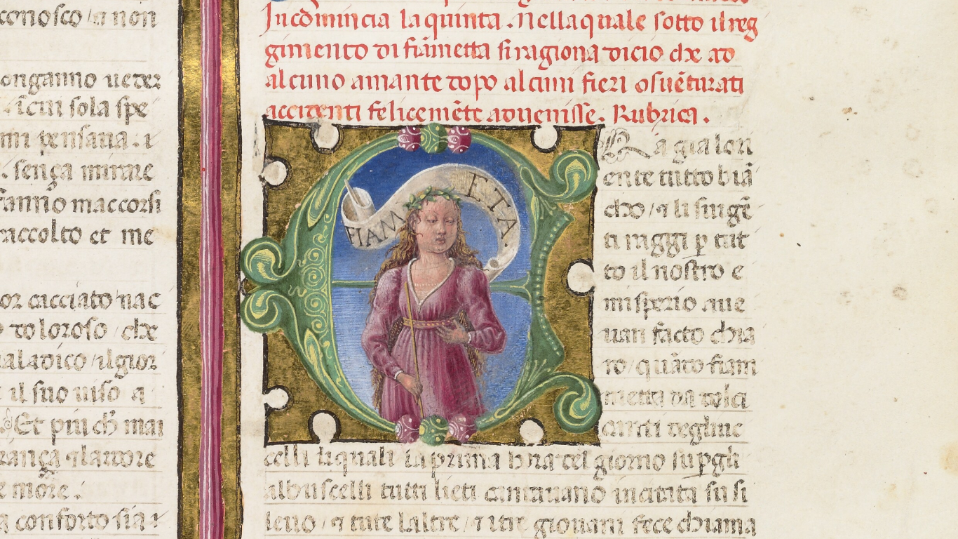 Oxford, Bodleian Library, Holkham misc. 49, f. 80v. Busto di Fiammetta, regina della quinta giornata, all'interno dell'iniziale figurata E(ra).