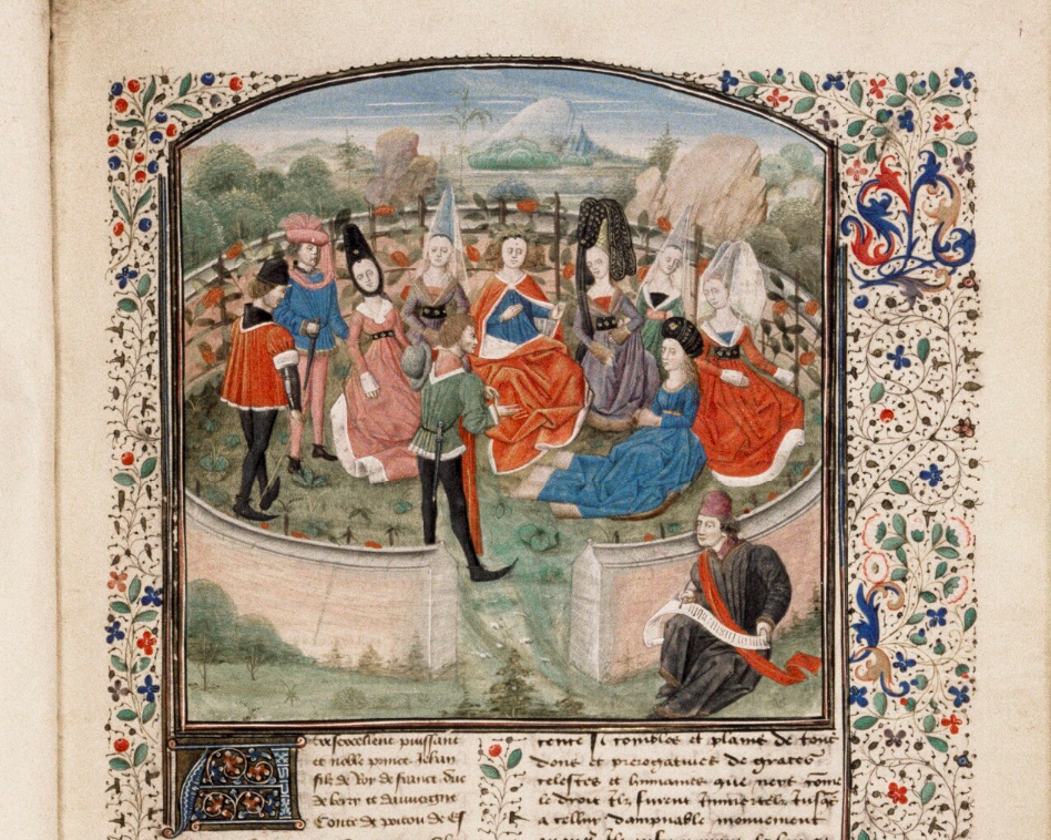 Oxford, Bodleian Library, Douce 213, f. 1r. La compagnia dei giovani novellatori si riunisce nel giardino fiesolano intorno a Pampinea, regina della prima giornata; all'esterno del muro siede Boccaccio, intento a scrivere su un cartiglio.