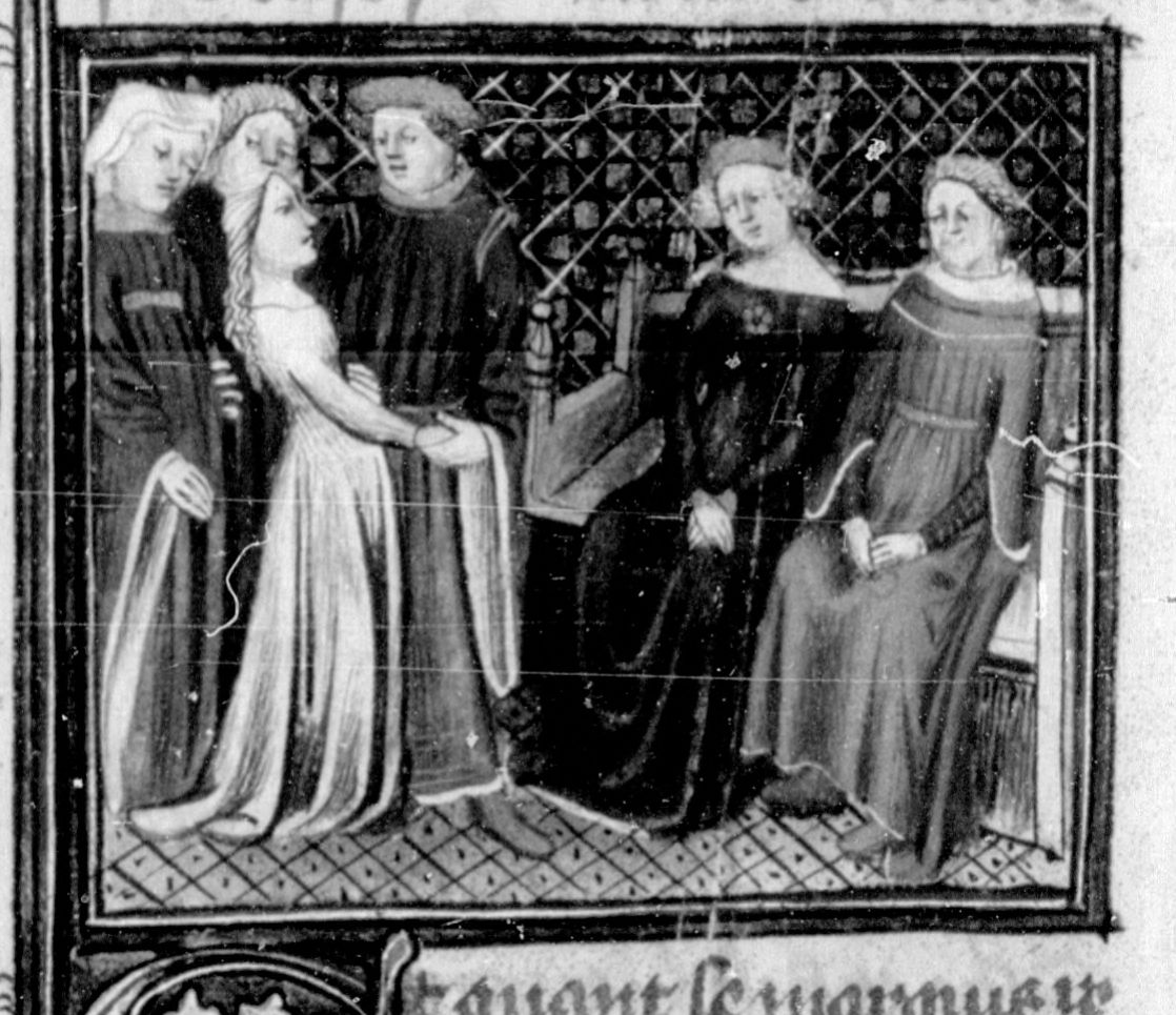 Parigi, Bibliothèque Nationale de France, Fr. 12459, f. 141v. Il copista del manoscritto, datato 21 aprile 1414, è Jehan de Lengres. Gualtieri accoglie nuovamente Griselda come marchesa e le rivela che i loro figli sono ancora vivi.