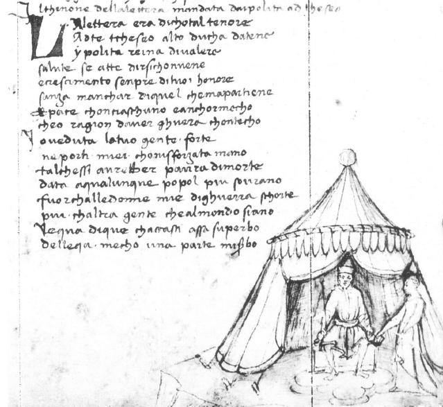 Napoli, Biblioteca Statale Oratoriana del Monumento Nazionale dei Gerolamini, C. F. 2.8, f. 13v. Il copista del manoscritto è Guido di Piero di Giovanni de Ricci. Seduto nella sua tenda, Teseo riceve una missiva di Ippolita consegnata da un'ambasciatrice.