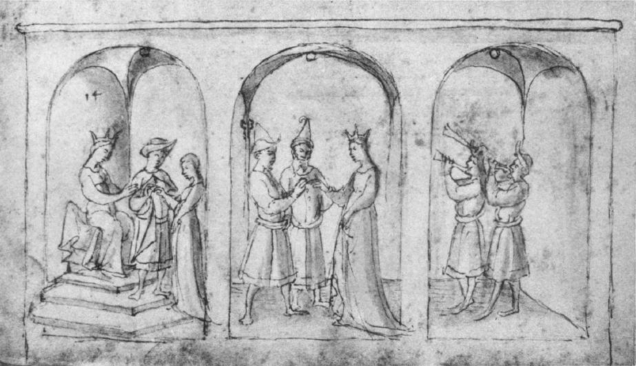 Napoli, Biblioteca Statale Oratoriana del Monumento Nazionale dei Gerolamini, C. F. 2.8, f. 17v. Il copista del manoscritto è Guido di Piero di Giovanni de Ricci. L'illustrazione rappresenta tre arcate di un loggiato: a sinistra, Ippolita unisce in matrimonio un'Amazzone ed un soldato ateniese; al centro, Ippolita sposa Teseo; a destra due musici suonano degli strumenti a fiato.