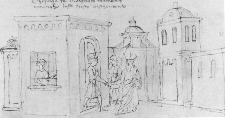 Napoli, Biblioteca Statale Oratoriana del Monumento Nazionale dei Gerolamini, C. F. 2.8, f. 37r. Il copista del manoscritto è Guido di Piero di Giovanni de Ricci. Arcita viene riconosciuto da Piritoo e lasciato uscire di prigione.