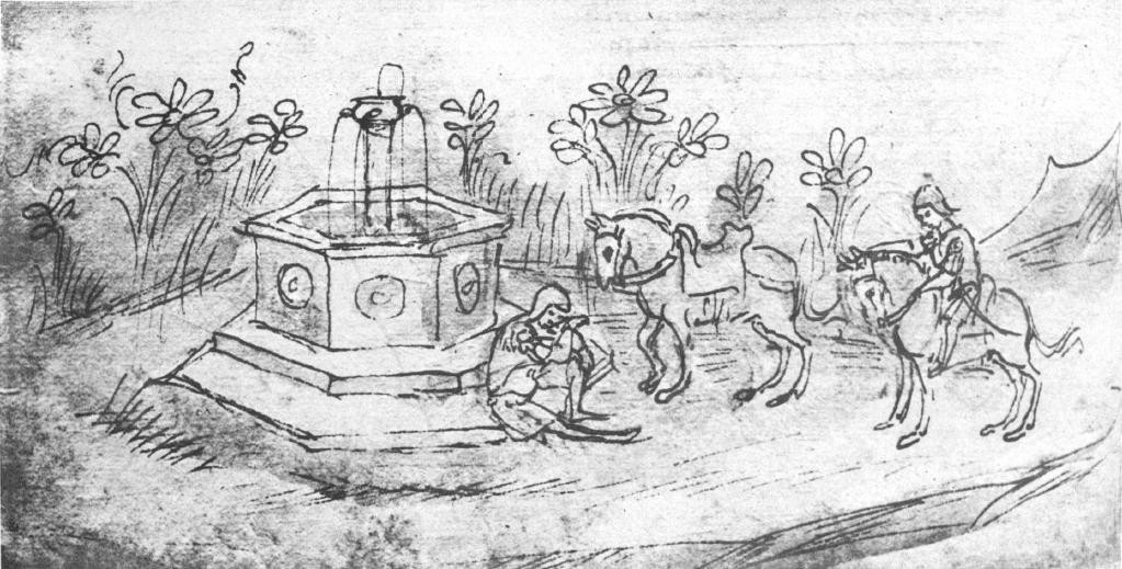 Napoli, Biblioteca Statale Oratoriana del Monumento Nazionale dei Gerolamini, C. F. 2.8, f. 51v. Il copista del manoscritto è Guido di Piero di Giovanni de Ricci. Palemone sorprende Arcita addormentato nel boschetto accanto ad una fontana.