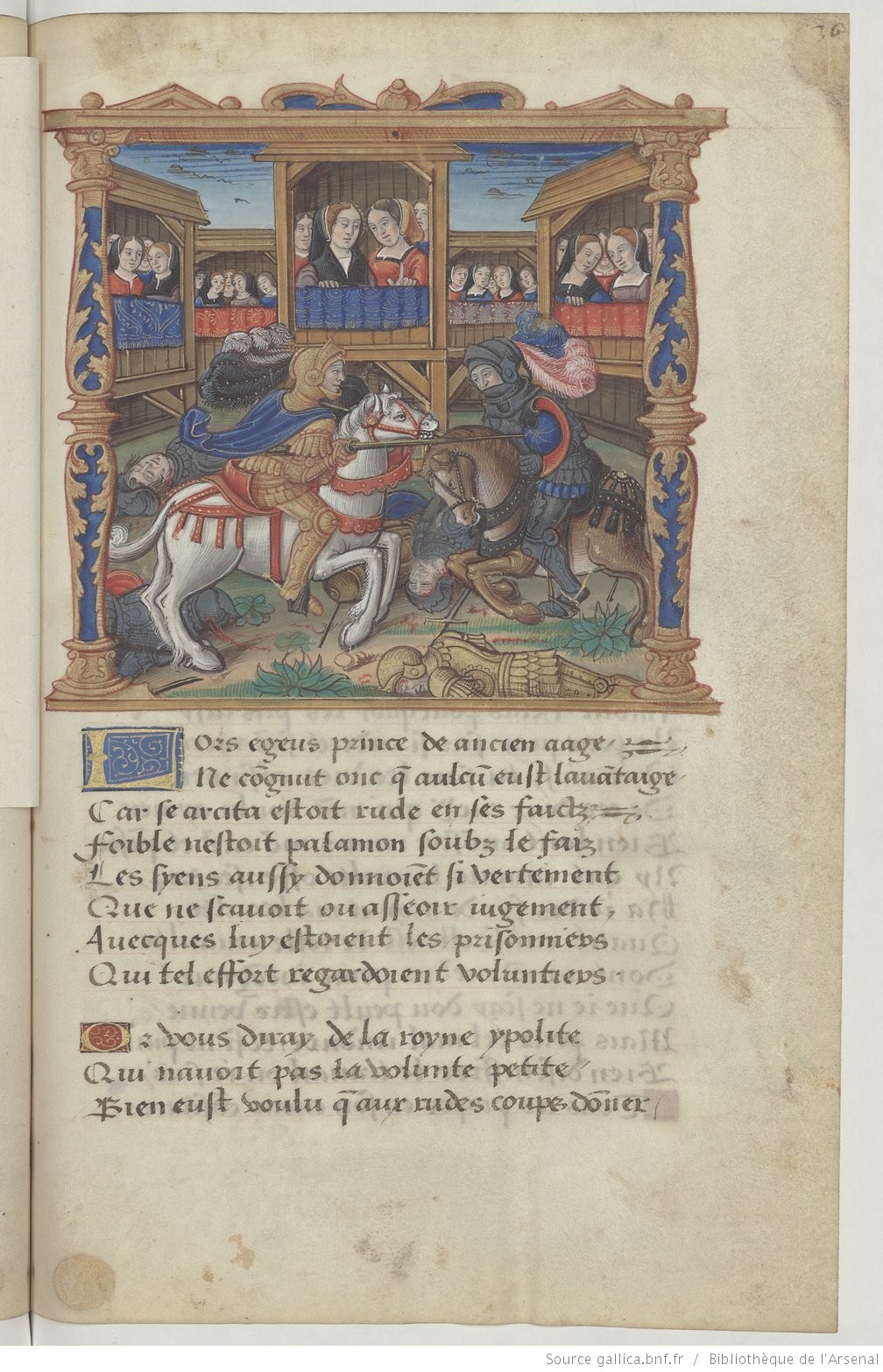 Parigi, Bibliothèque de l'Arsenal, 5116, f. 36r. Davanti alla corte si svolge il duello tra Arcita e Palemone.