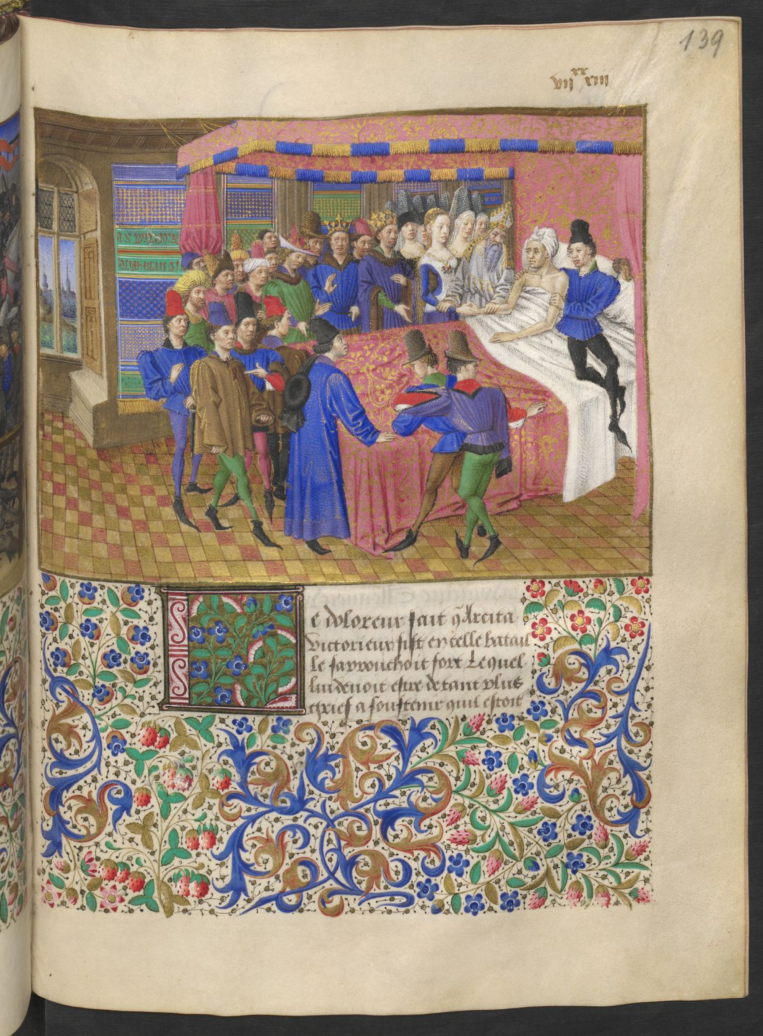 Vienna, Österreichische Nationalbibliothek, 2617, f. 139r. Emilia sposa Arcita al suo capezzale, quando questi è in punto di morte.