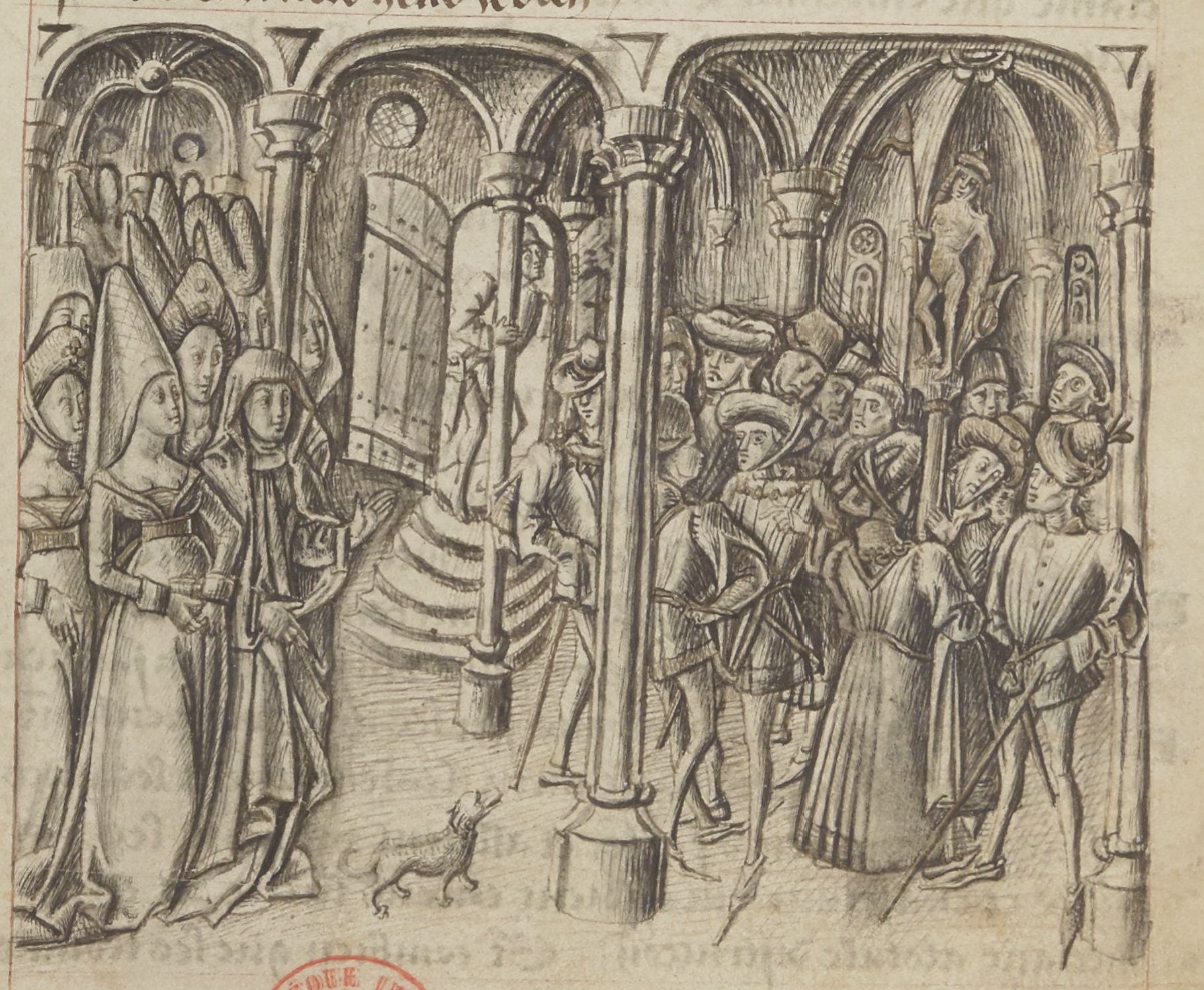 Parigi, Bibliothèque Nationale de France, Fr. 25528, f. 4v. Il copista del manoscritto è Pierre d'Amboise. Troiolo scorge Criseide durante una celebrazione al tempio di Atena e se ne innamora.