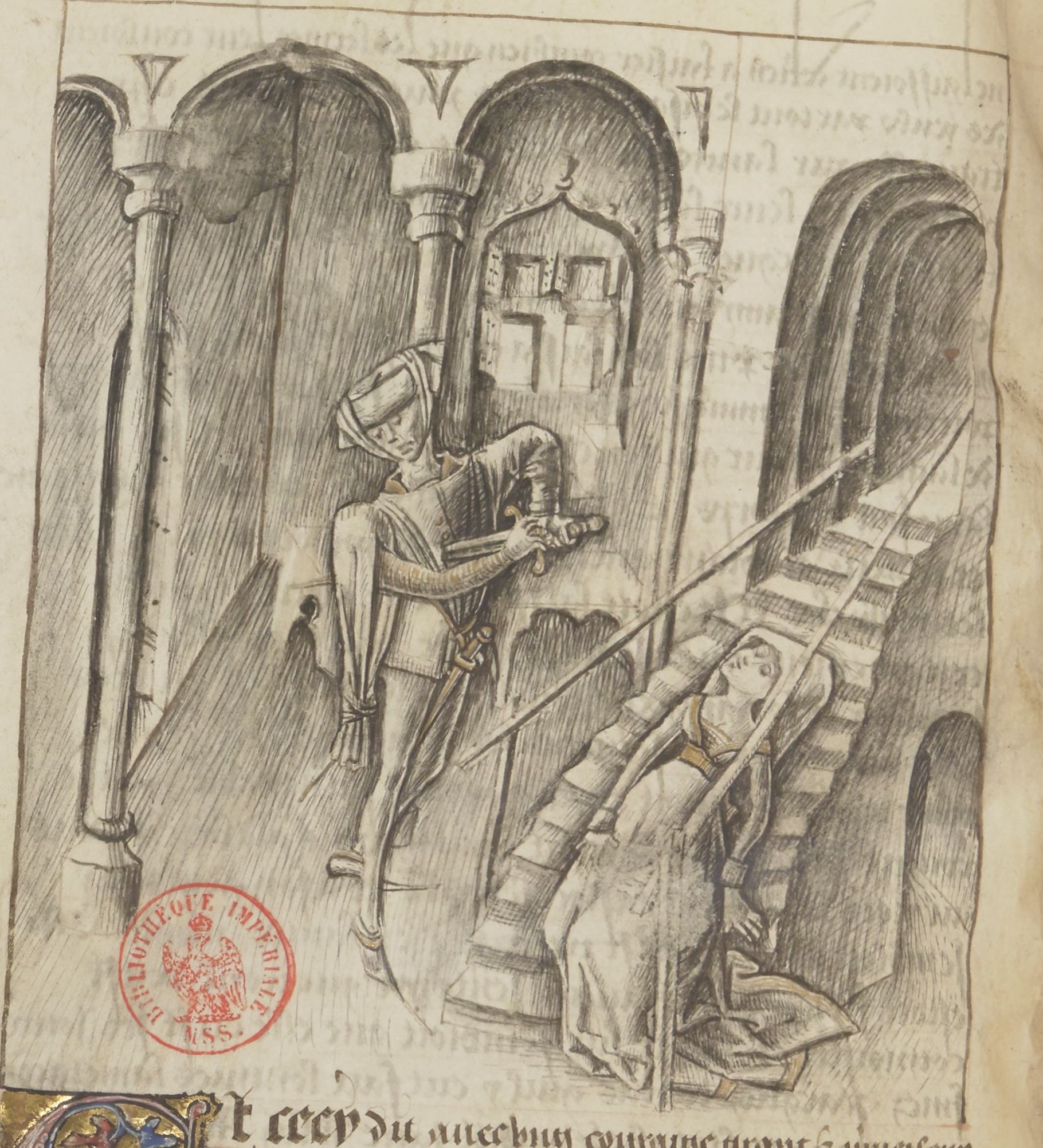 Parigi, Bibliothèque Nationale de France, Fr. 25528, f. 55v. Il copista del manoscritto è Pierre d'Amboise. Troiolo, vedendo Criseide svenuta e credendola morta, si trafigge il petto con una spada.