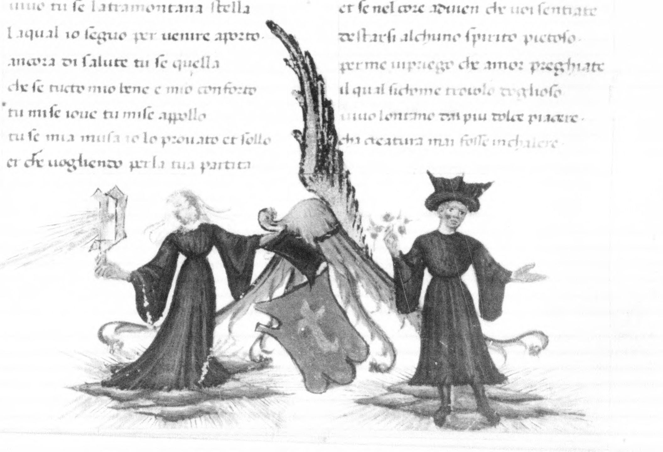 Parigi, Bibliothèque Nationale de France, It. 486, f. 6r. Nel margine inferiore sono raffigurati Criseide e Troiolo su due nuvole raggiate: la donna è rappresentata con un'iniziale P nella mano destra ed un grifone rosso e dorato nella sinistra, mentre Troiolo nella destra regge un ramo fiorito.