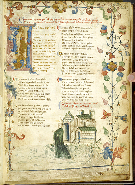 New York, Pierpont Morgan Library, M 371, f. 5r. Il copista del manoscritto, datato ottobre 1414, è Pace di Giuliano da Olibano. Il veggente Calcante fugge da Troia dopo averne predetto la caduta.